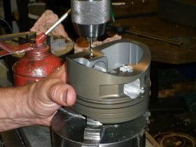 This picture shows the oil-inlet and also front side oil that helps to lubricate and chill the pistons, rods and piston pins.